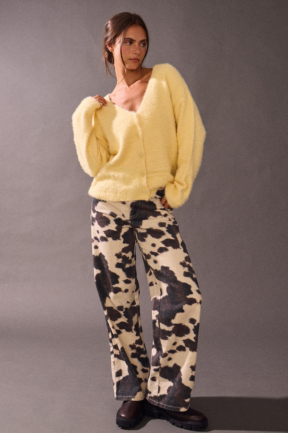 This soft brushed button-up cardigan features a fluffy texture and relaxed fit with dropped shoulders for effortless comfort. Its deep V-neckline and matching button closure offer a clean, refined look. Designed for cozy wear, this versatile piece suits all seasons, making it an essential layering option for any wardrobe.