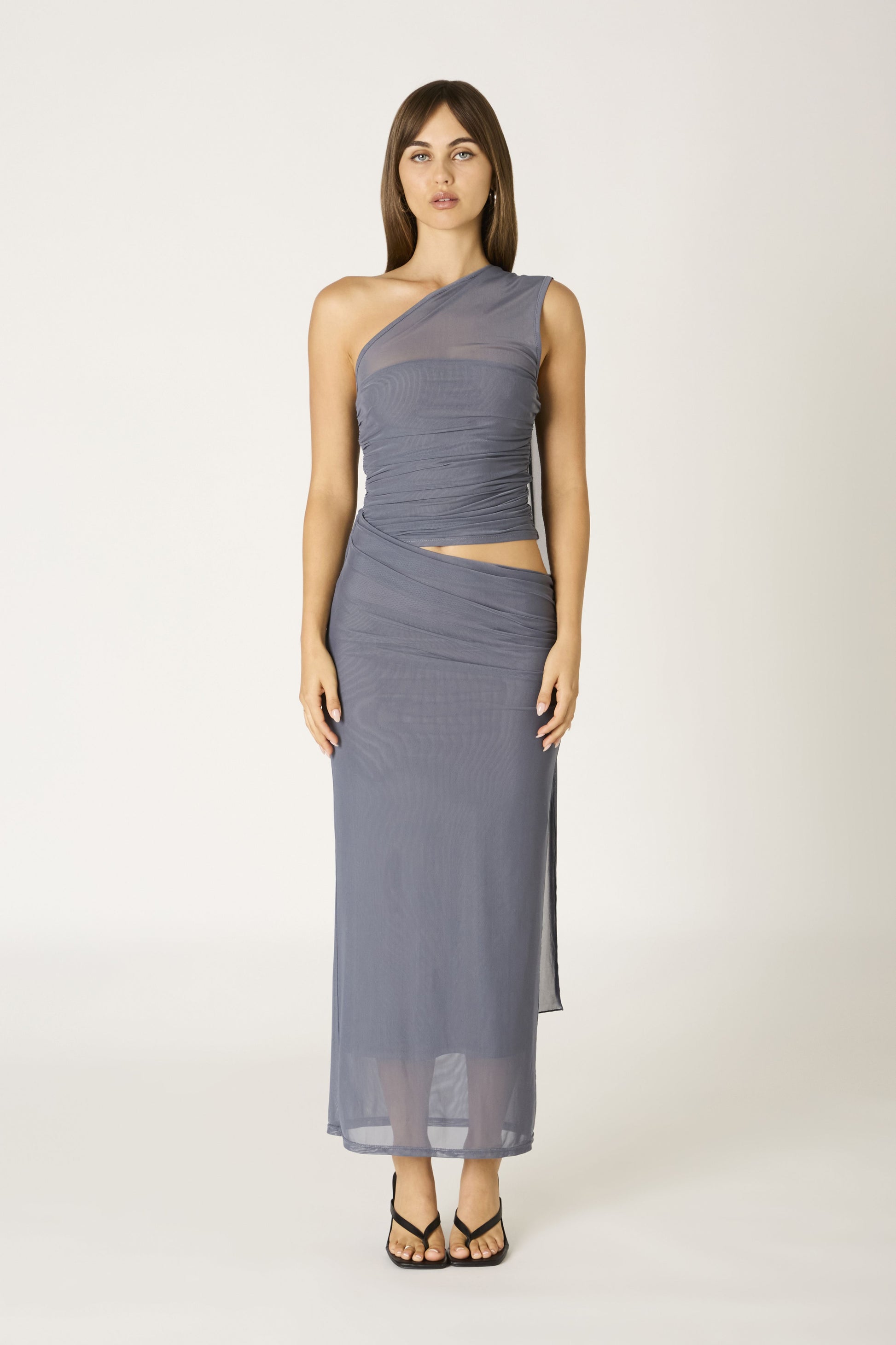 Elevate your wedding guest wardrobe with this sophisticated mesh maxi dress. The striking one-shoulder silhouette commands attention while sheer paneling adds an element of refined allure. A strategically ruched bodice creates flattering dimension, while the side cutout at the waist introduces modern edge to this timeless style. This piece seamlessly transitions from ceremony to reception, offering the perfect balance of elegance and contemporary design for any formal occasion.