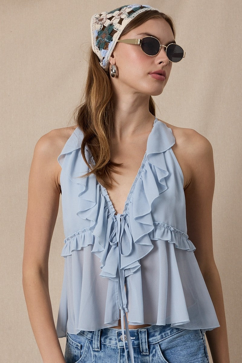 This sleeveless lace ruffle top features a sheer solid color design with a flattering V-neckline. The front double ties add a sophisticated touch, allowing for an adjustable fit that enhances comfort and style. Perfect for layering or wearing alone, this top combines delicate lace detailing with modern elegance for a versatile addition to your wardrobe.
