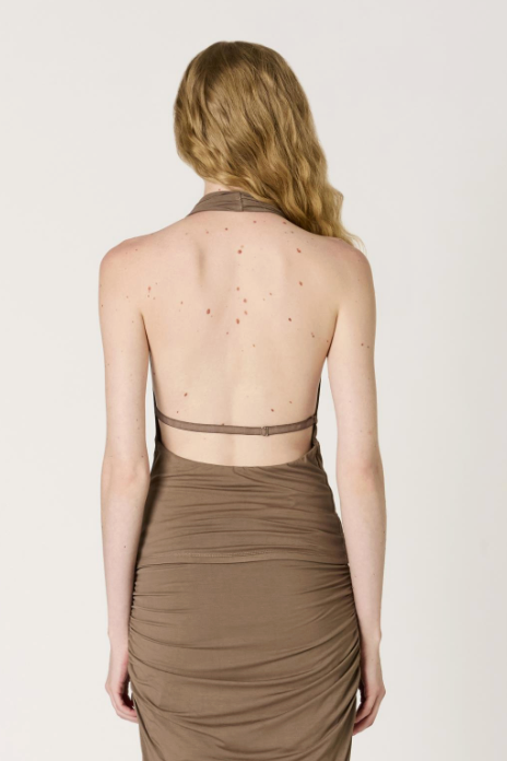 The Declan Top features a striking brown halter design with an elegant cowl neckline that drapes beautifully. The open back creates a bold, modern silhouette, while an adjustable strap ensures a customized fit for all body types. Perfect for making a statement at any occasion, this versatile piece transitions effortlessly from day to night. The rich brown tone pairs well with your existing wardrobe, offering endless styling possibilities.