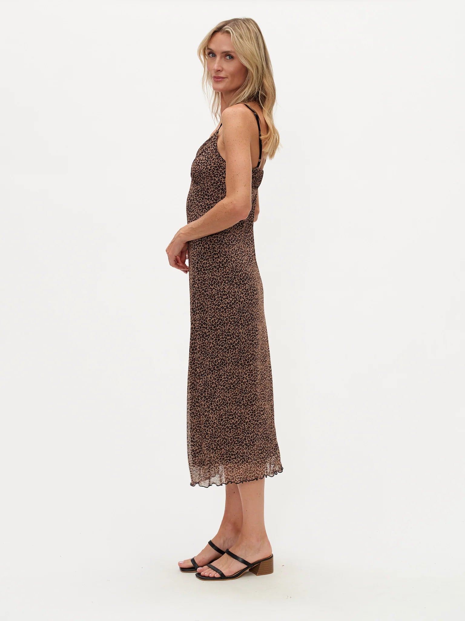 The Lana Dress merges contemporary design with enduring appeal through its striking cheetah print and thoughtfully engineered construction. Delicate spaghetti straps and a refined V neckline provide elegant framing, while strategically placed lining beneath sheer fabric delivers both visual interest and appropriate coverage. Cut to midi length, this piece transitions seamlessly from evening occasions to everyday wear. The breathable, fluid material ensures comfort and movement throughout your day, making it a versatile foundation piece for a well-curated wardrobe.