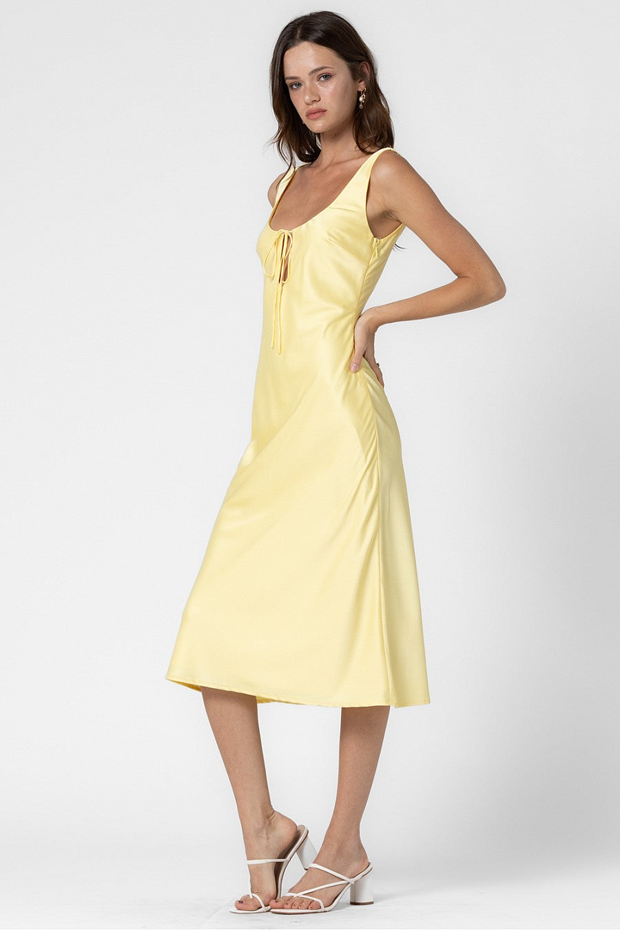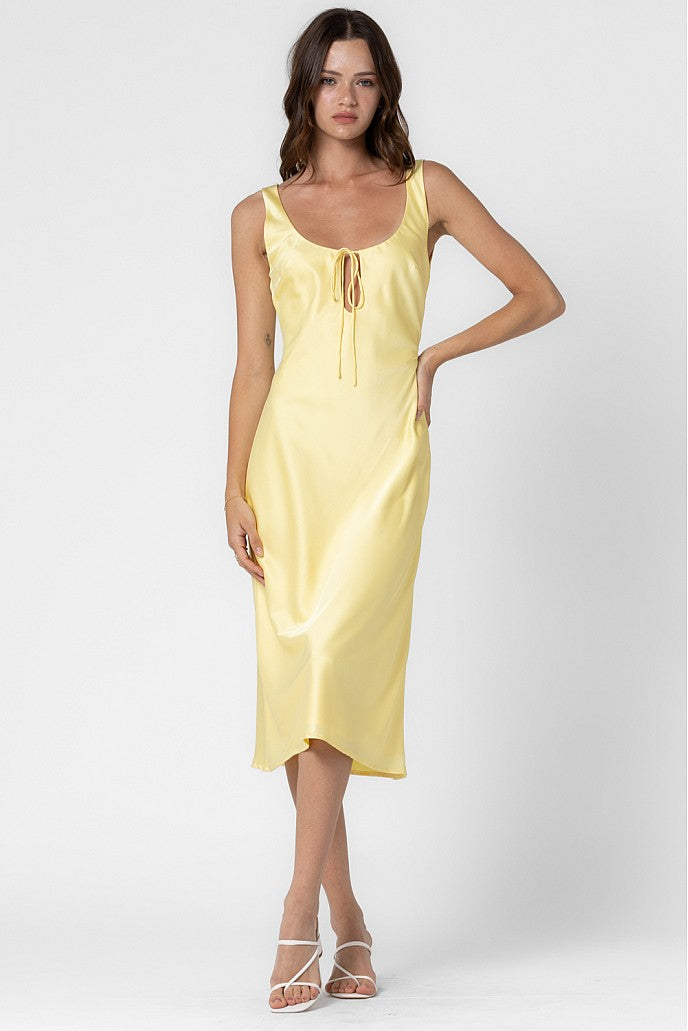 Elevate your style with our lemon spritz midi dress. Made with a satin front and a flattering keyhole design, this dress will bring a touch of elegance to any occasion. Perfect for adding a pop of color to your wardrobe, while staying comfortable and stylish.