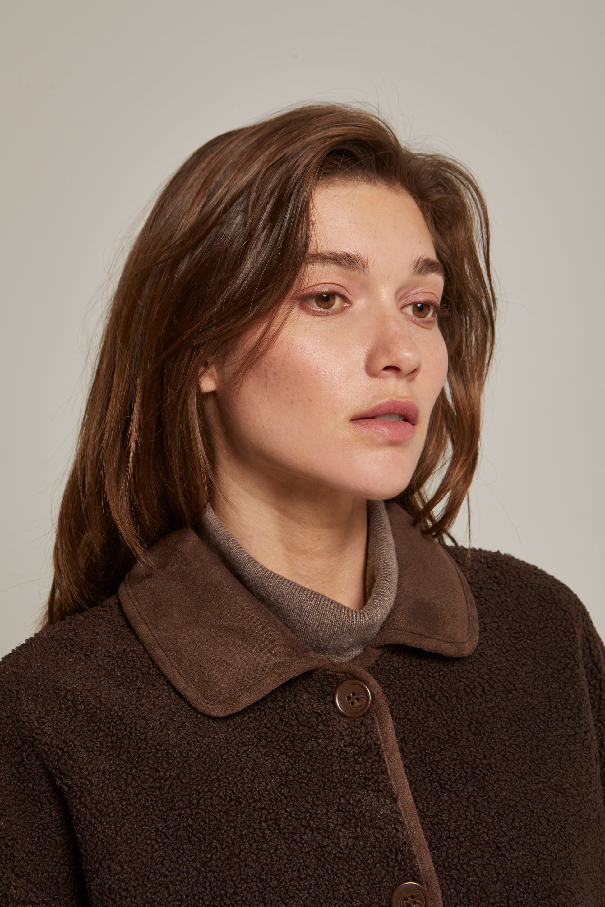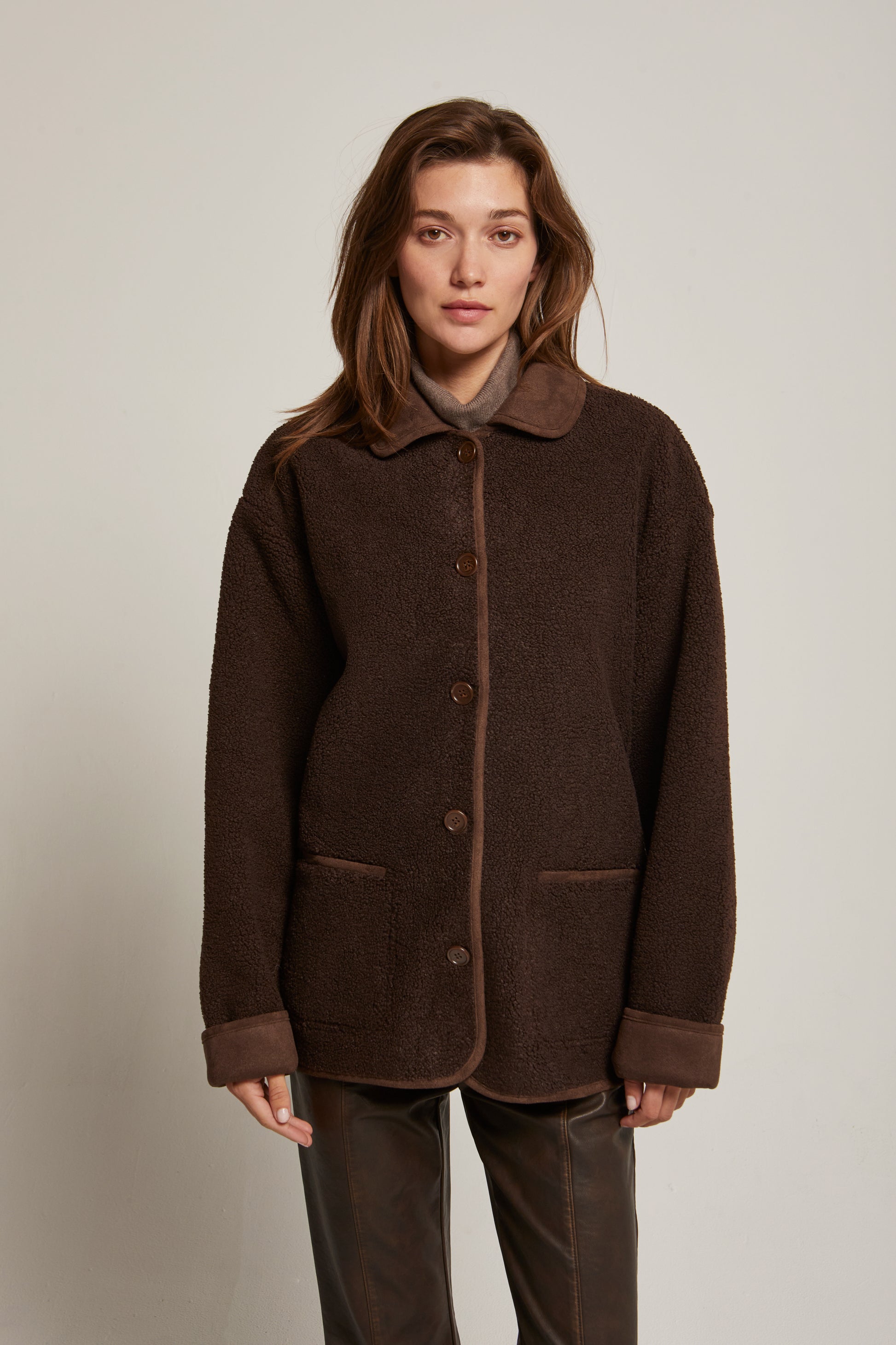 The Leonora Shearling Jacket offers superior warmth and comfort with its plush brown teddy shearling construction. Designed for both style and functionality, this jacket provides excellent insulation while maintaining a refined silhouette. Its soft texture ensures cozy wear throughout colder seasons, making it an essential outerwear piece for expert layering and timeless fashion.
