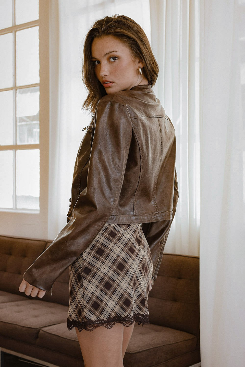 Engineered with premium faux leather, this cropped moto jacket delivers edge-forward style without compromise. The structured silhouette features classic moto detailing—asymmetrical zip closure, notched lapels, and strategically placed hardware—creating an instantly polished look. The cropped length pairs effortlessly with high-waisted bottoms, elongating your frame while maintaining that coveted rebellious attitude. Durable, cruelty-free construction ensures this piece withstands seasonal rotation. A versatile layer that transitions from casual to refined, this jacket is the foundation of any modern wardrobe.