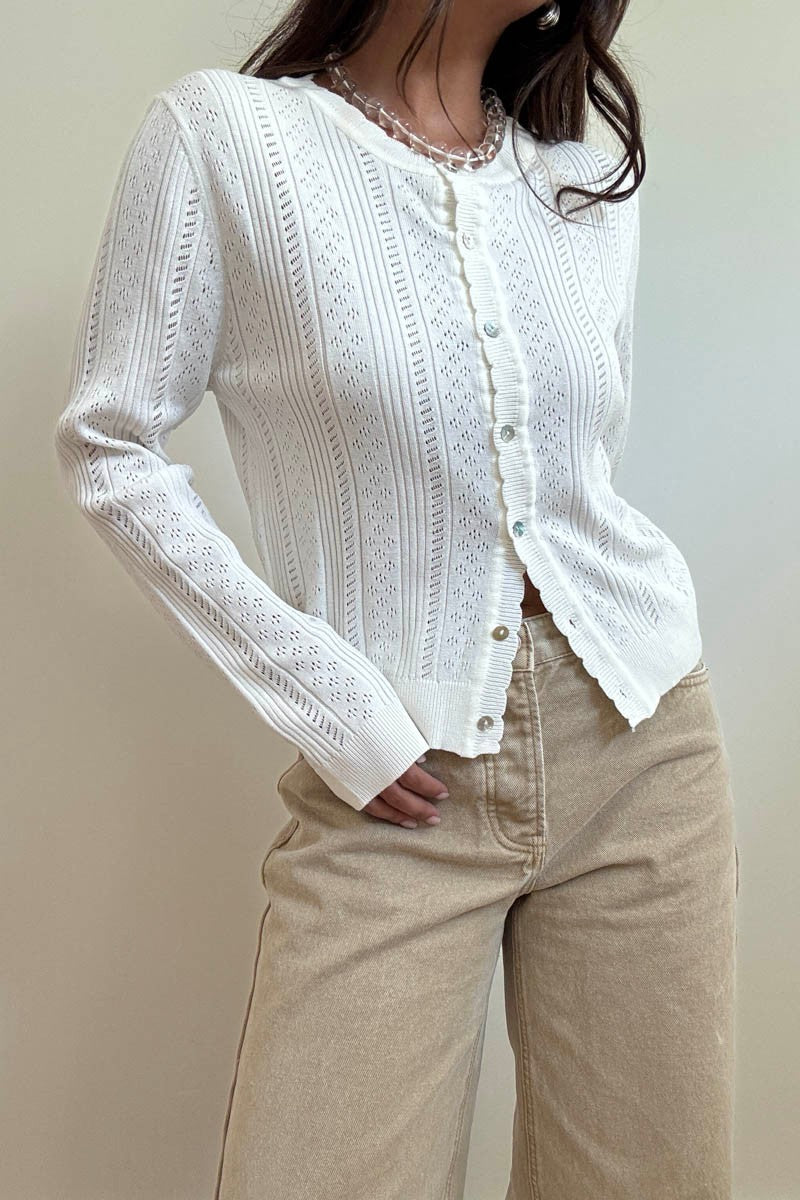 This white Sally Pointelle knit cardigan offers a refined layering option with its delicate eyelet detailing and classic button-front closure. Designed with a lightweight, breathable knit, it suits transitional weather, while the cropped silhouette adds contemporary flair. Ideal for pairing over tanks and dresses or worn alone, it enhances your wardrobe with understated elegance and versatile style.