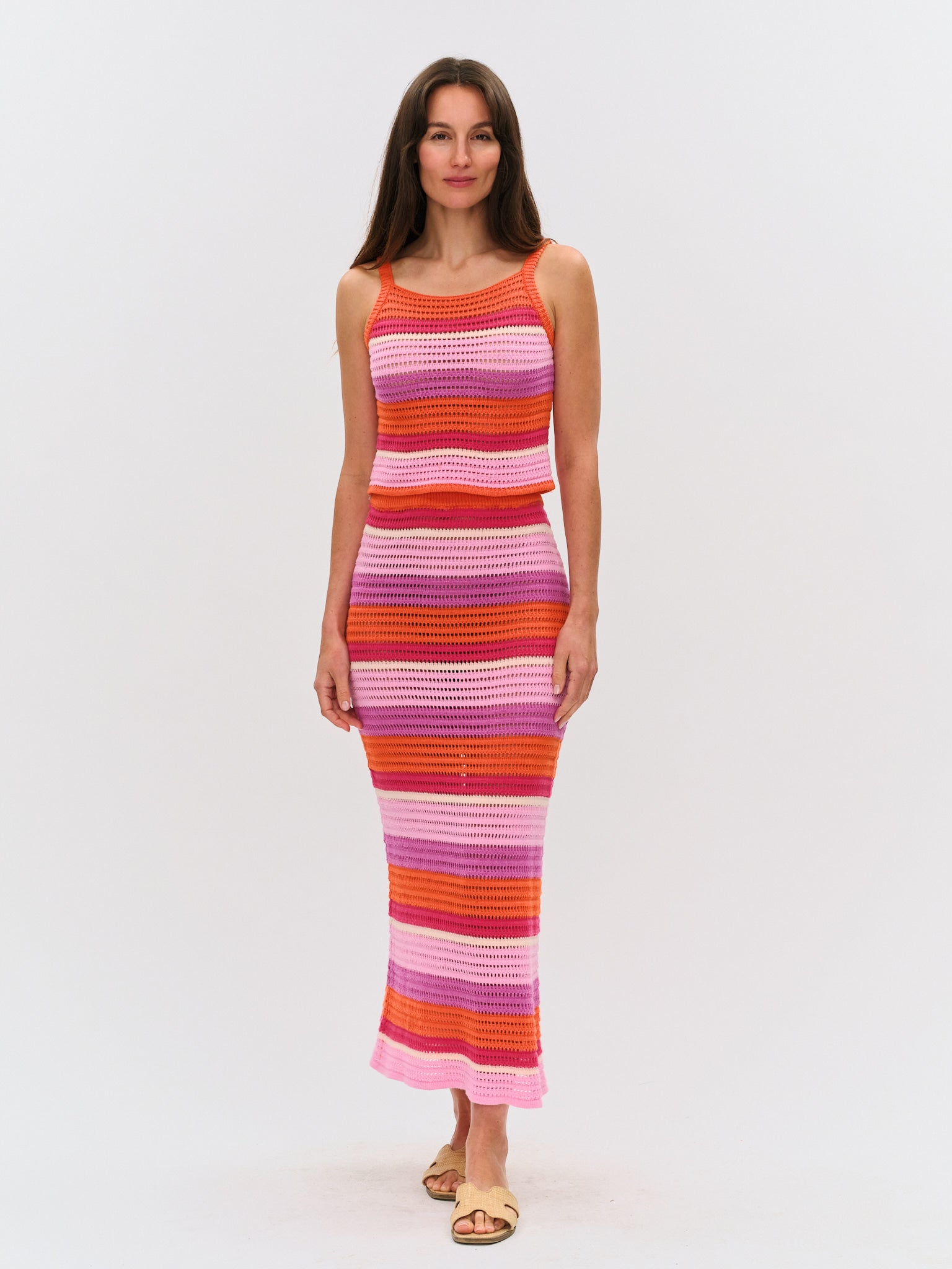 Elevate your warm-weather wardrobe with this multicolor stripe knit crochet maxi skirt. Crafted with intricate crochet detailing, it features a vibrant striped pattern that brings movement and dimension to any outfit. The flowing maxi silhouette offers comfort and effortless style, perfect for casual days or dressed-up occasions. Pair it seamlessly with our Sienna crochet tank top for a coordinated, bohemian-inspired look that celebrates artisanal craftsmanship.
