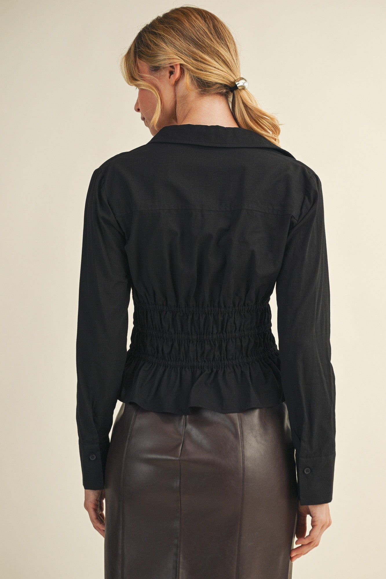 This shirt top features an elastic waist with a tie closure, offering a customizable fit that enhances comfort and silhouette. Its design allows for easy adjustment, making it suitable for various body shapes while maintaining a polished appearance. Ideal for layering or wearing alone, this top combines practicality with a refined style.