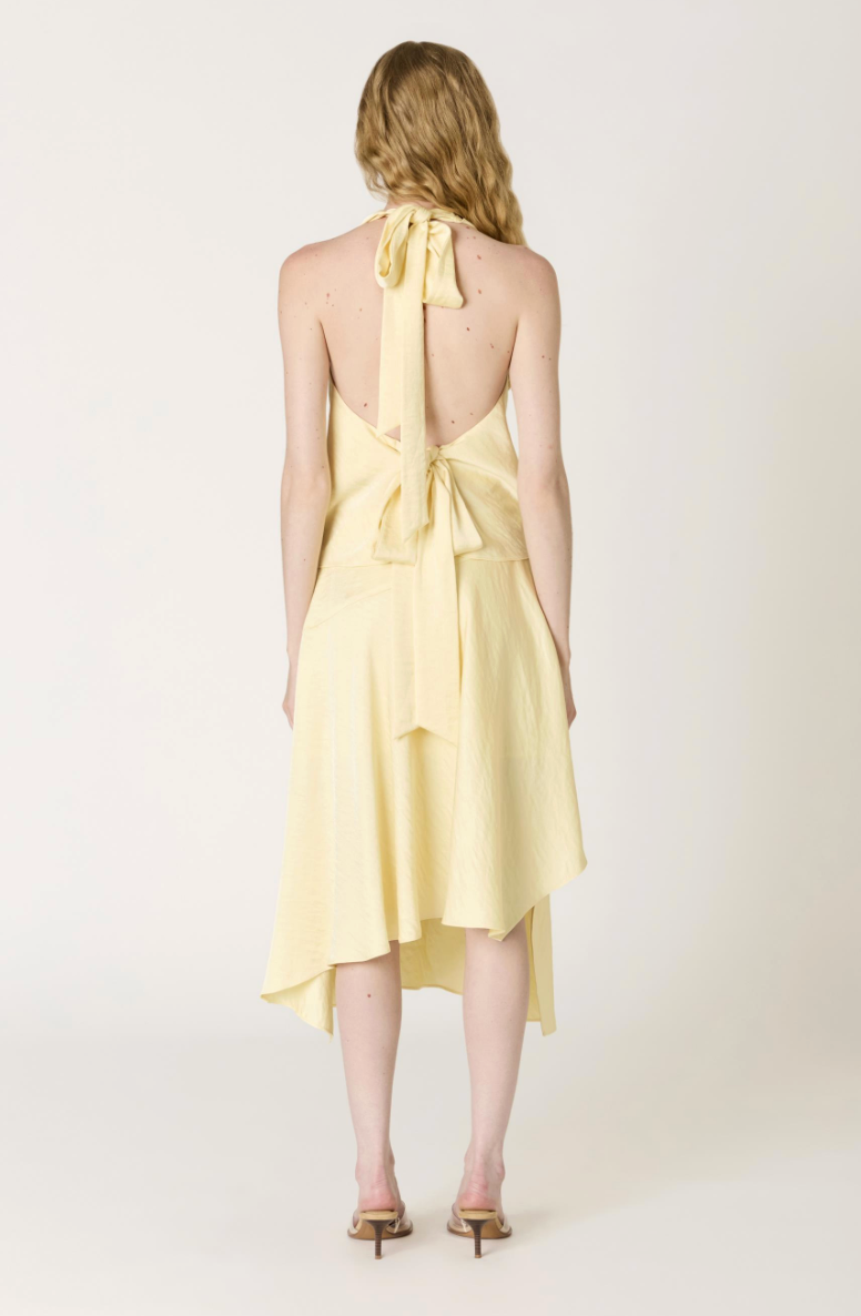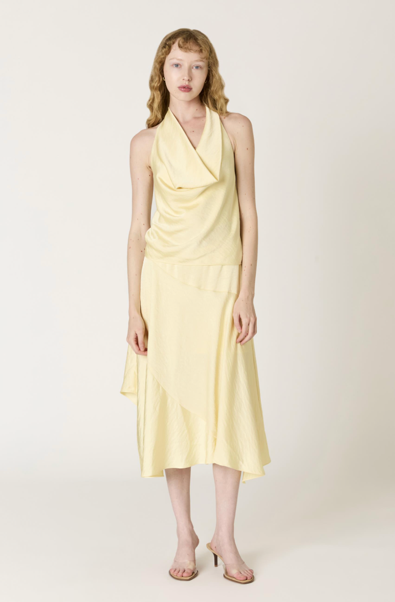 The Valencia midi skirt features an asymmetrical silhouette that creates dynamic movement and visual interest. Crafted from luxurious satin in a warm butter yellow, this piece offers a sophisticated drape that flatters the figure while maintaining an effortless elegance. The midi length provides versatility for both elevated casual and refined occasions. Perfect for those seeking a statement piece that balances contemporary design with timeless appeal.