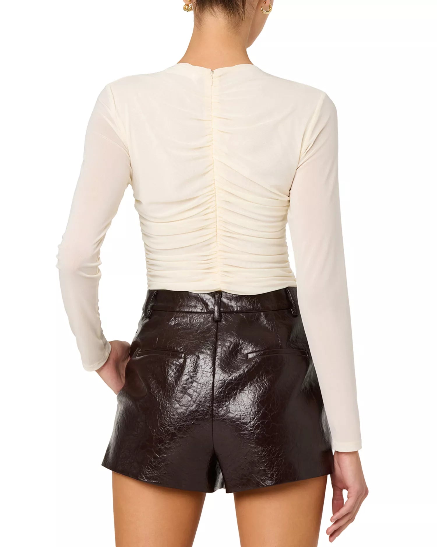 The Yasmin Top features a sophisticated V-neck design with a decorative keyhole button detail at the front. Long sleeves provide coverage while strategic ruching at the front and back creates flattering dimension and visual interest. A discreet back zipper ensures easy dressing, while the lined interior offers comfort and structure. A refined piece that transitions seamlessly from day to evening wear.